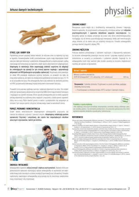 Physalis Ashwagandha forte bio zawiera najwyższej jakości ekstrakt z ashwagandhy (indyjskiego żeń-szenia) KSM-66®. Potrzeba było ponad dekady badań, aby opracować ekstrakt z ashwagandhy o wysokiej standaryzacji na witanolidy, zachowując jednocześnie wszystkie proporcje występujące w naturze. Jest to najlepiej zbadany i bezpieczny ekstrakt z ashwagandhy o szerokim spektrum działania na świecie. Z jednej strony korzeń ashwagandhy poprawia wydajność fizyczną i umysłową, zapewnia więcej energii i witalności oraz optymalizuje koncentrację i czujność. Z drugiej strony zapewnia zdrowy sen oraz wspiera nas w chwilowych sytuacjach stresowych.