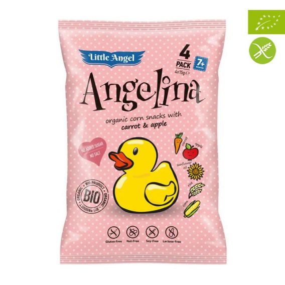 Angelina to ekologiczne, bezglutenowe chrupki kukurydziane z dodatkiem jabłuszka i marchewki. Stanowią pyszną i zdrowa przekąskę i mogą być bezpiecznie spożywane już przez najmłodsze dzieci (od 7 miesiąca). Chrupki stanowią idealną alternatywę dla sklepowych, smażonych chipsów pełnych tłuszczów trans o