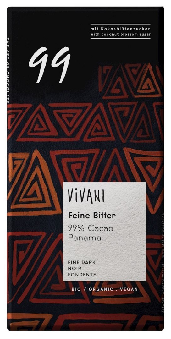 miazga kakaowa*, tłuszcz kakaowy*, cukier kokosowy* 0,5 %. (*certyfikowany składnik ekologiczny). Masa kakaowa minimum 99 %.